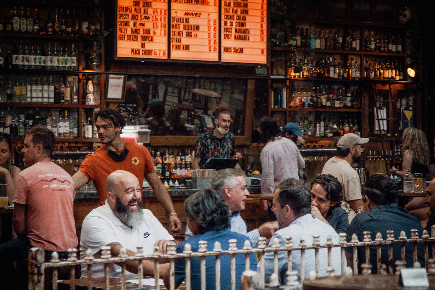 Carefully divided between big, group-friendly trestle tables, smaller stand-up tables and a quasi-restaurant area with comfy banquettes, booths and smarter finishes–the space seems smaller than its 400+ pax license.