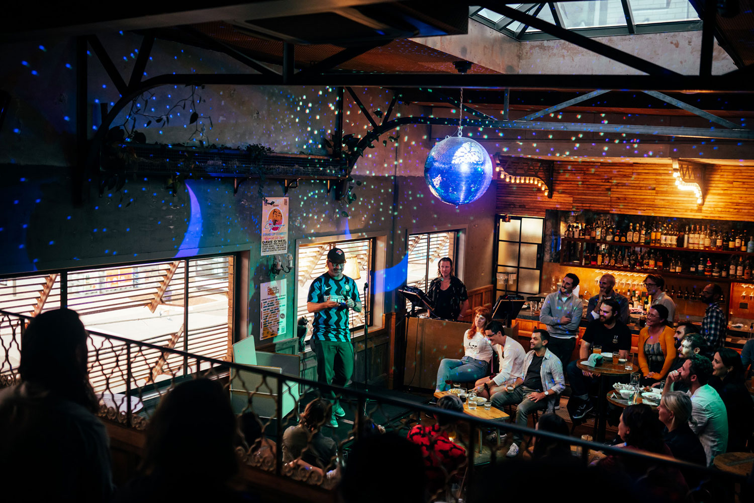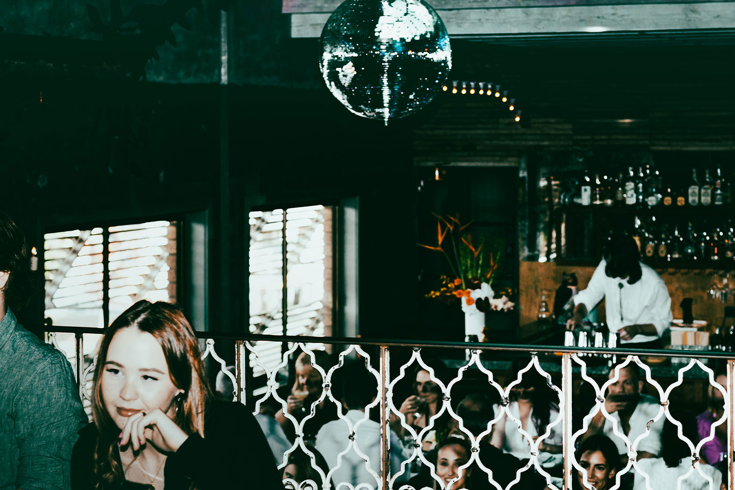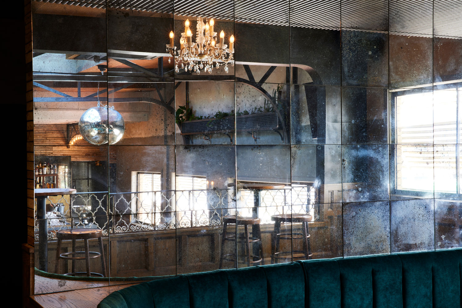 Natural light streams in through a large skylight during the day and tactfully darkens to make room for the glistening disco ball, kitsch floral wallpaper, green velvet banquette and chandeliers. A mezzanine looks down onto a DJ booth and the timber-clad bar.