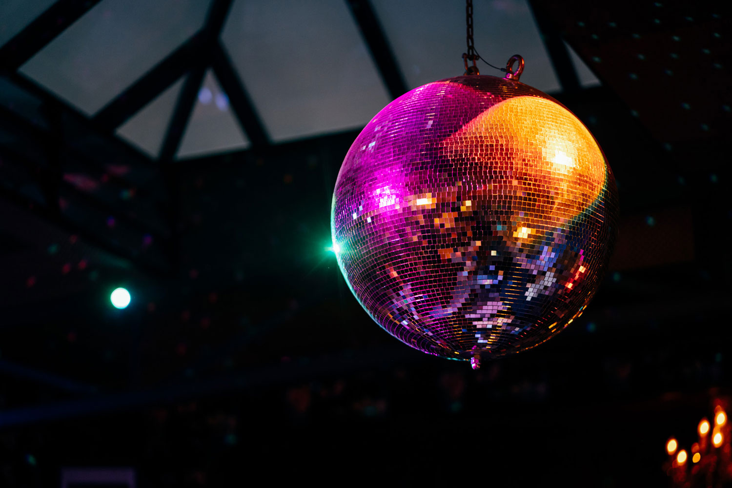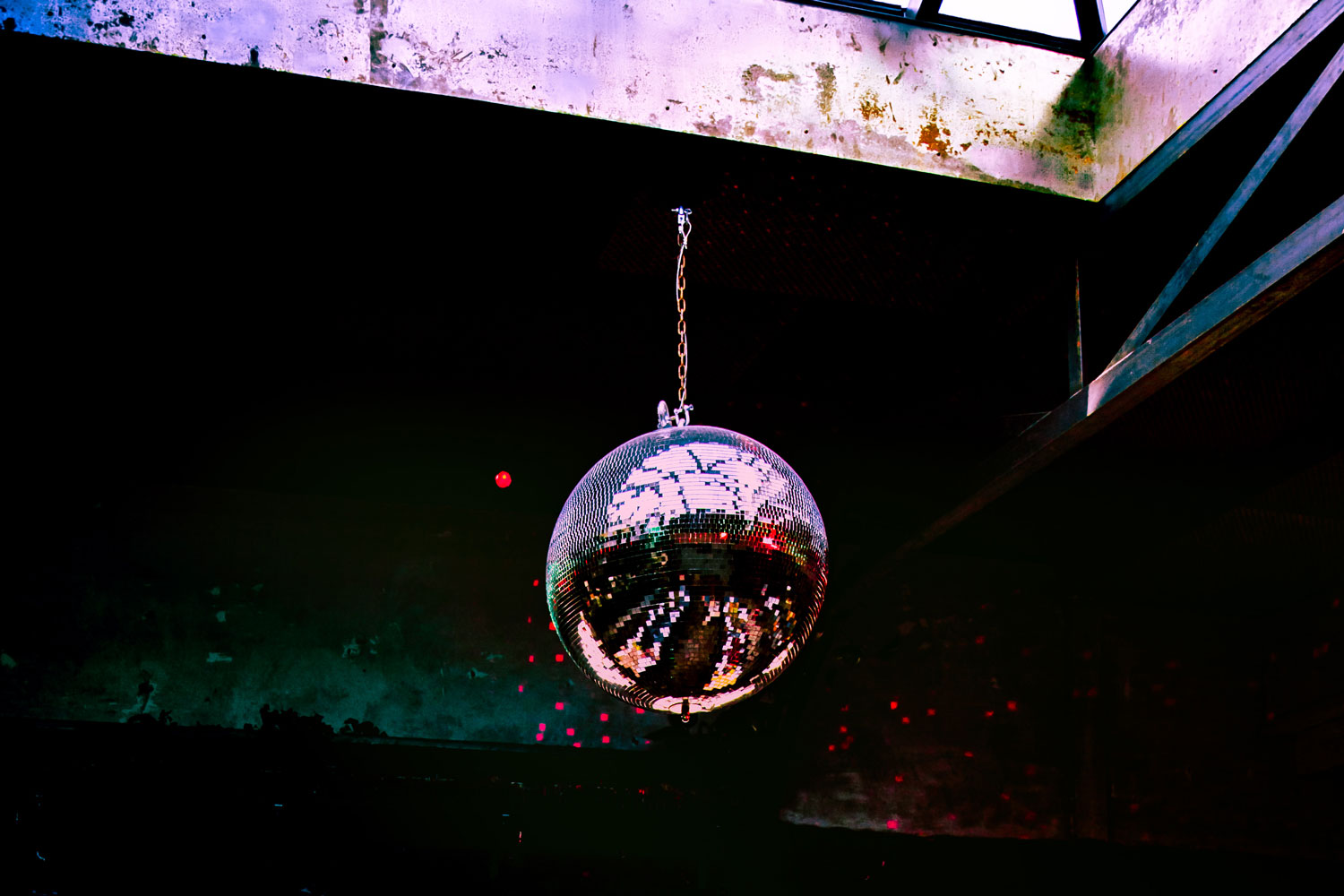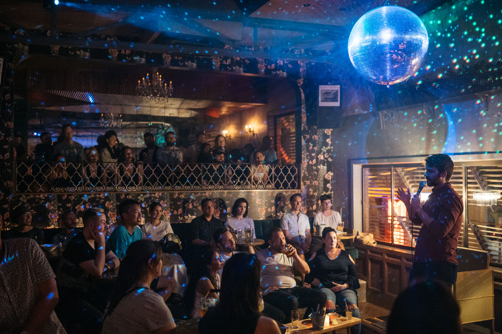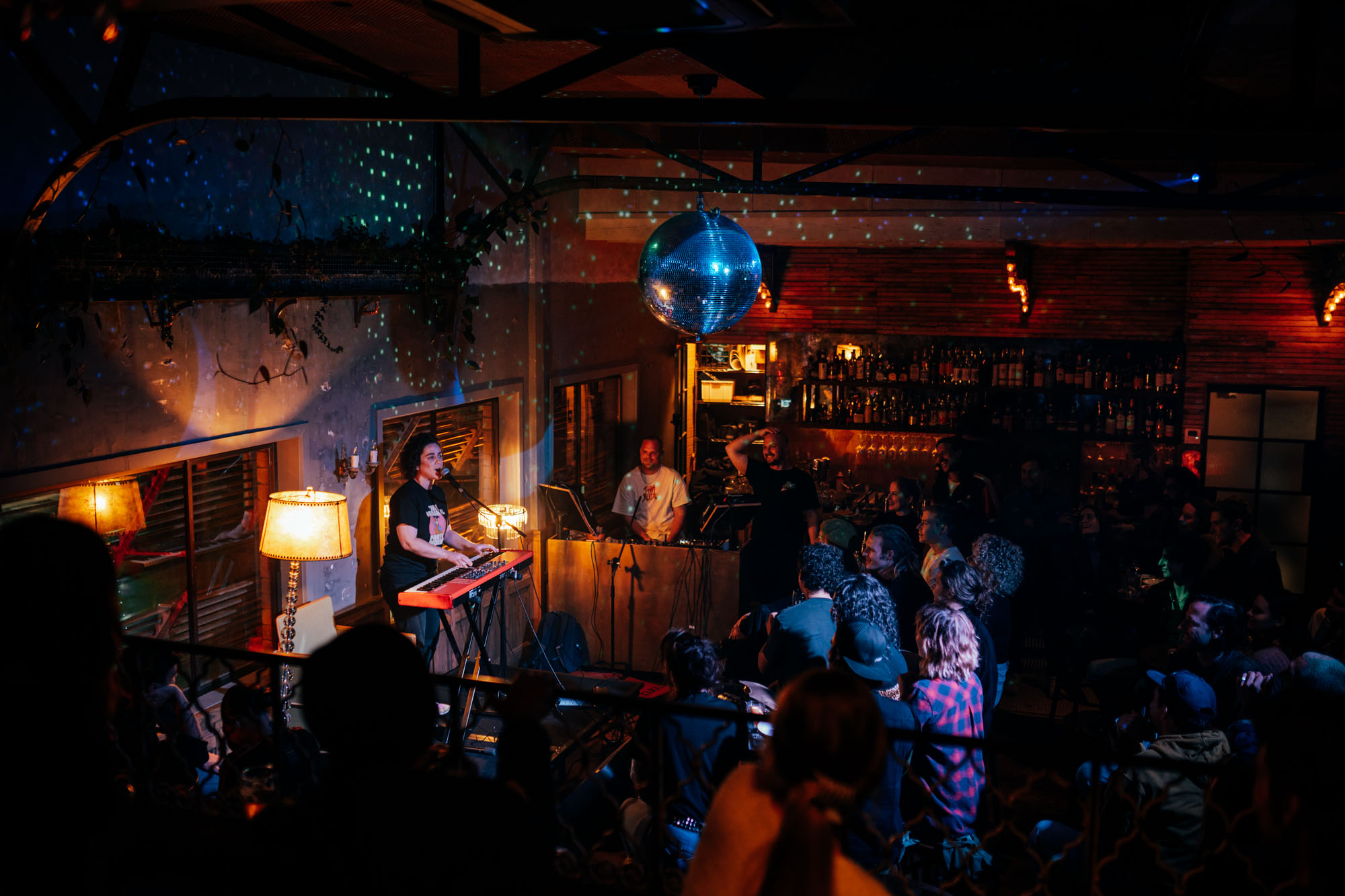 Natural light streams in through a large skylight during the day and tactfully darkens to make room for the glistening disco ball, kitsch floral wallpaper, green velvet banquette and chandeliers. A mezzanine looks down onto a DJ booth and the timber-clad bar.